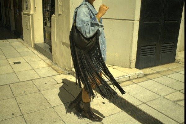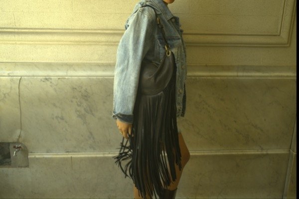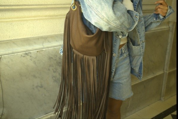 Bandolera de cuero vacuno con flecos de 50 cm de largo. Tira regulable con hebilla